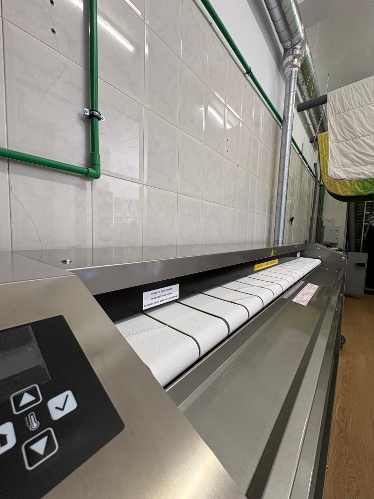 Nuestro sistema de secado controlado y calandra industrial de gran capacidad garantiza resultados uniformes, sin arrugas ni daños en los tejidos.